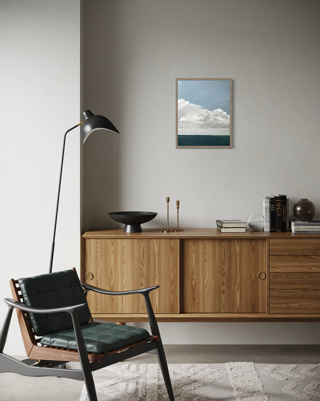 "Cloudwatch" captures the quiet strength of the sea beneath a luminous sky. Layers of gray and white clouds gather and rise above calm, dark water, creating a serene focal point that suits contemporary coastal and modern interiors alike.
