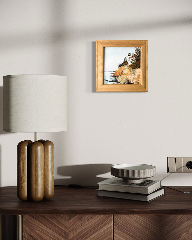 Warm golden light washes over the pines and rugged shoreline, capturing the calm beauty of Maine’s coast. This original oil painting evokes a peaceful, glowing moment by the sea, perfect for bringing a touch of coastal serenity to any space.