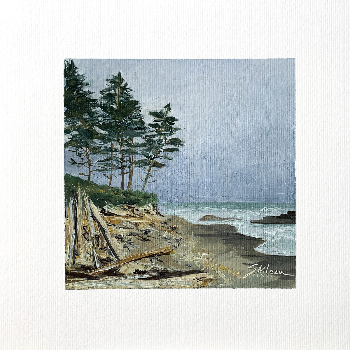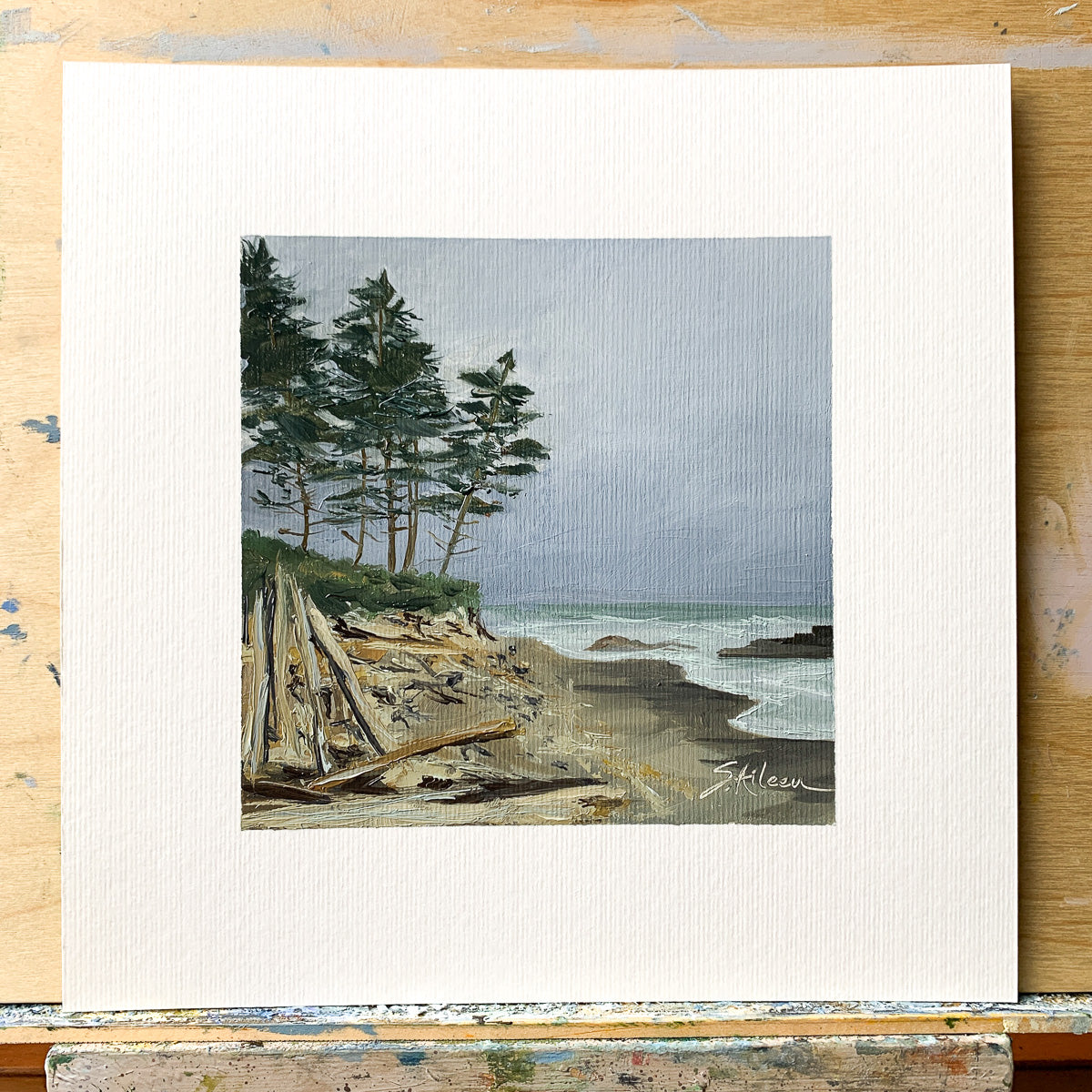 Title: Pacific Mood – Captures the beauty of the Pacific Northwest coast as low waves recede along a driftwood-strewn beach.