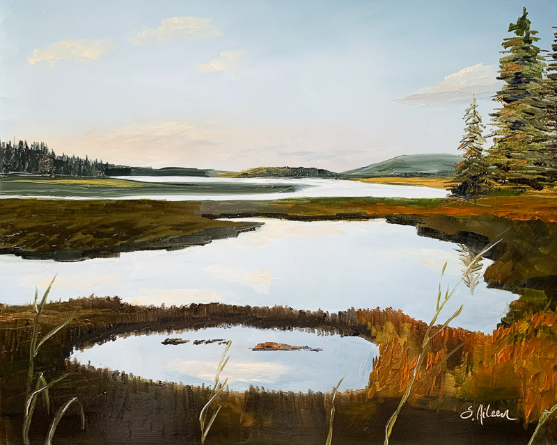 This original 8x10" oil painting captures the serene beauty of Acadia National Park at early sunset, with the sky reflected across the water and soft, atmospheric lighting. Marsh grasses and distant pines add subtle detail, creating a peaceful, contemplative landscape perfect for any collection.